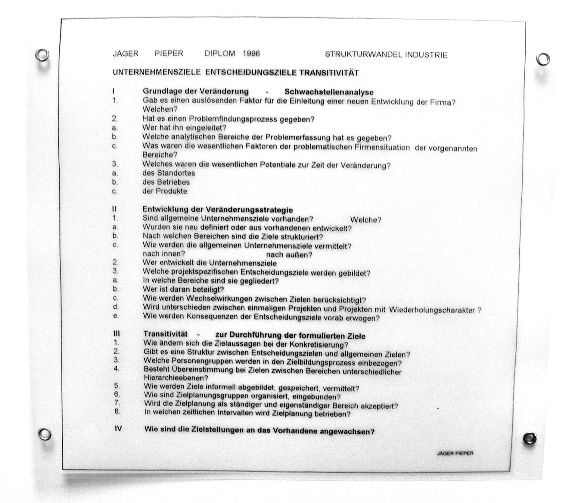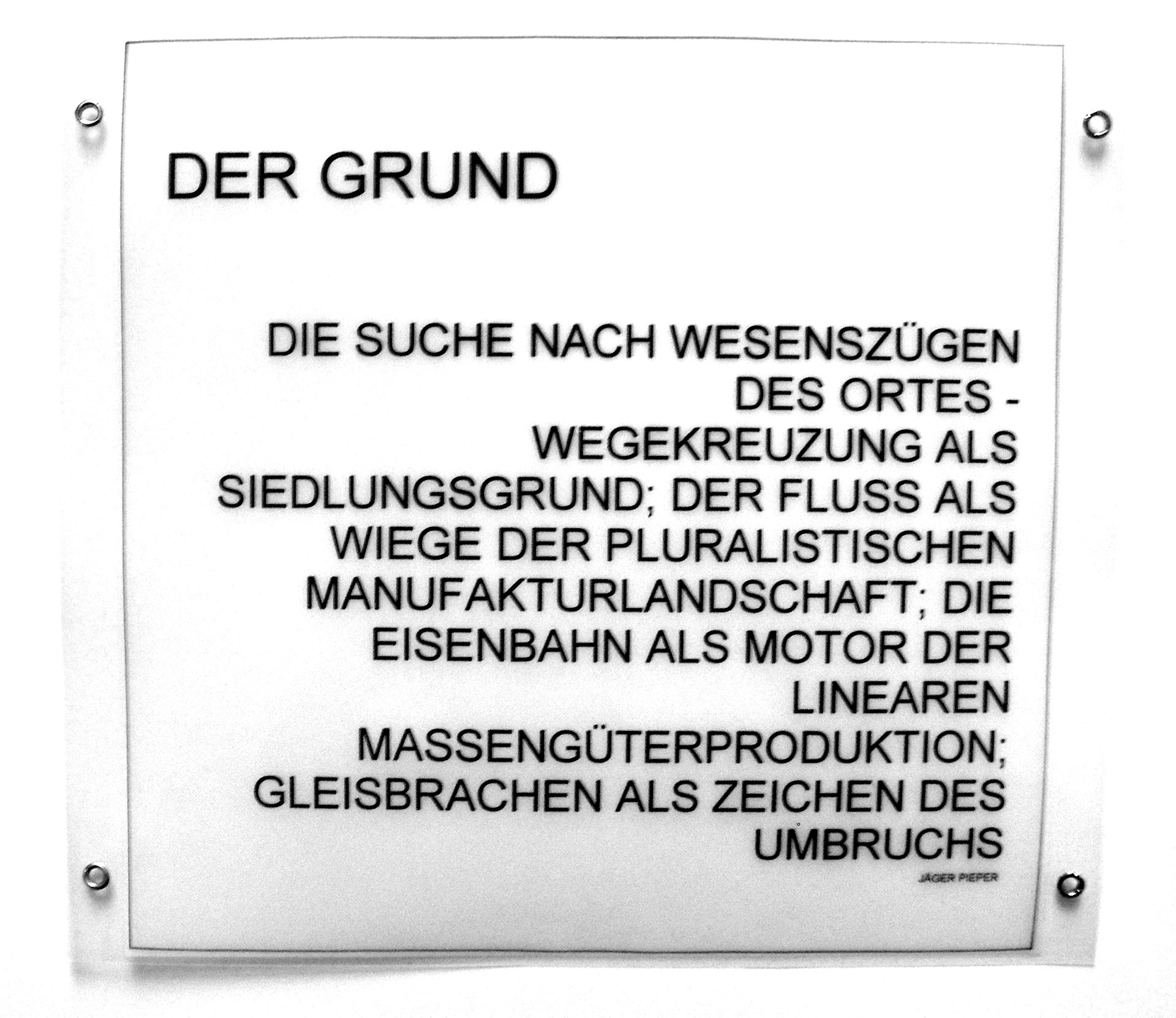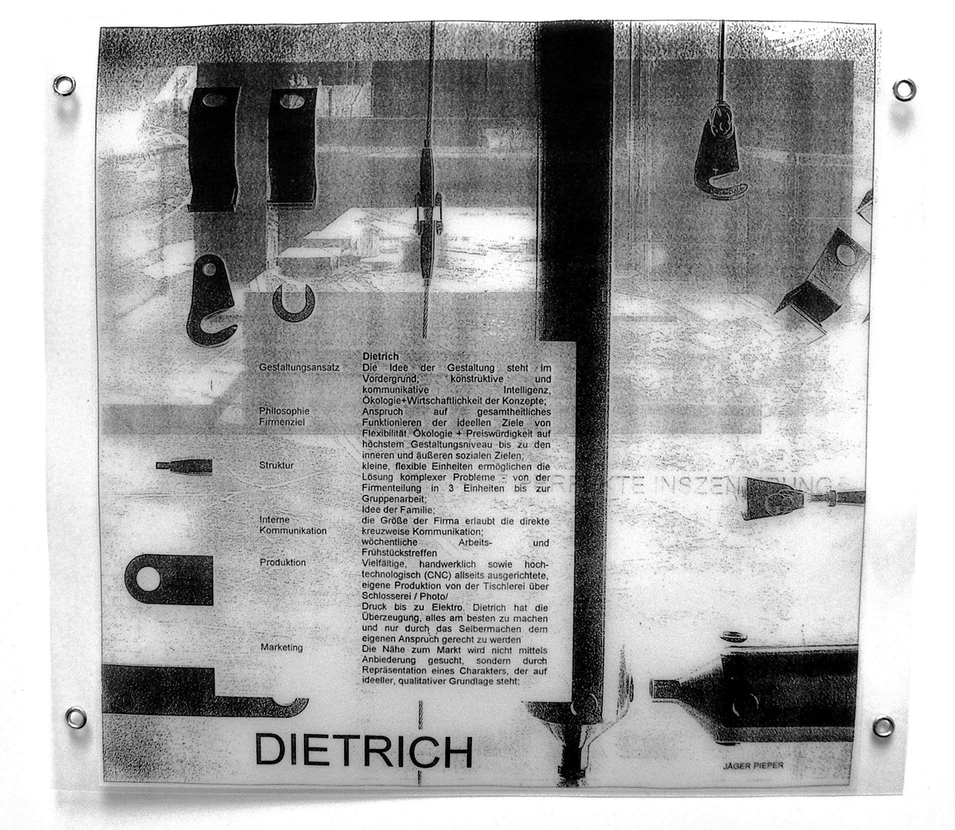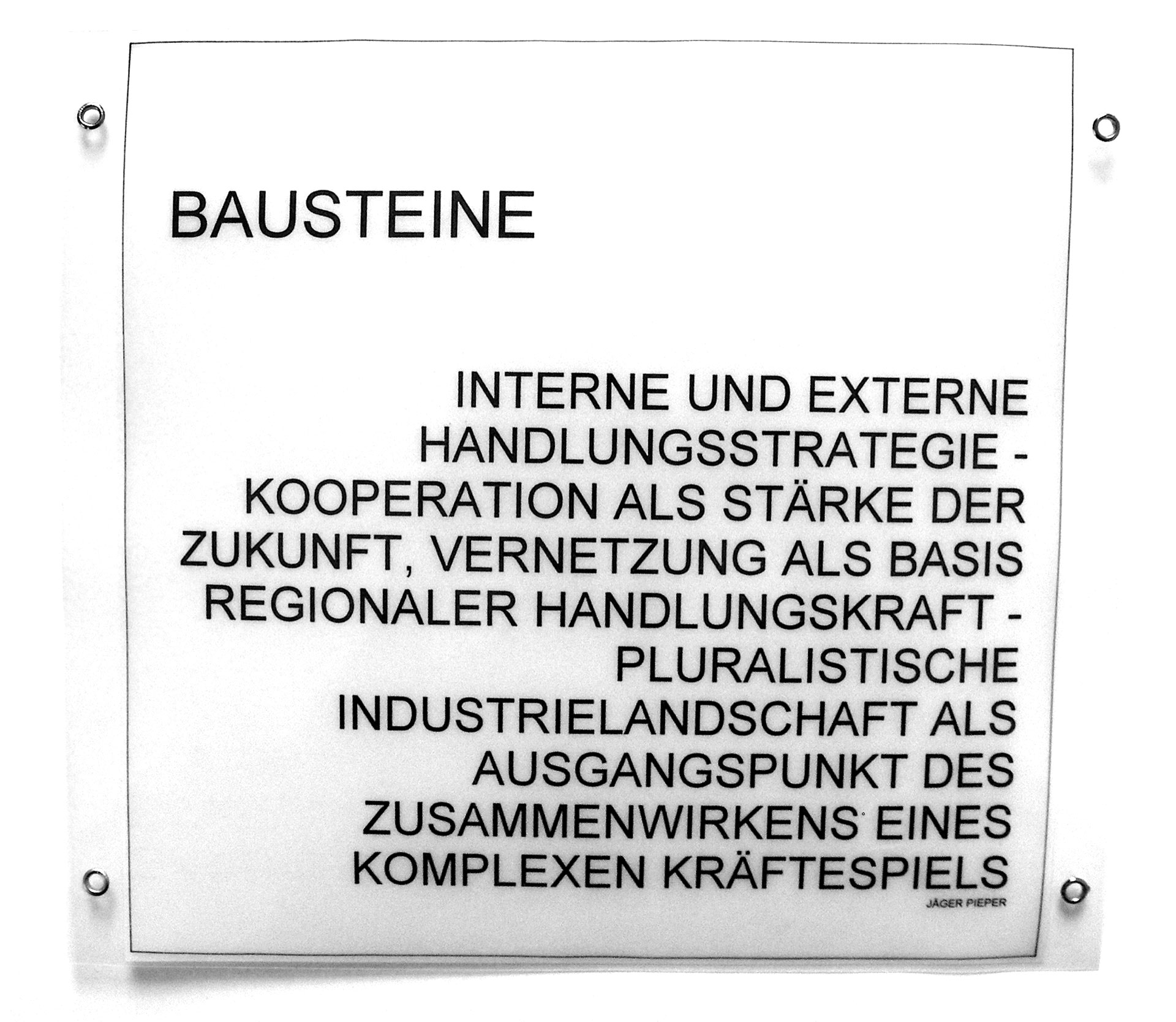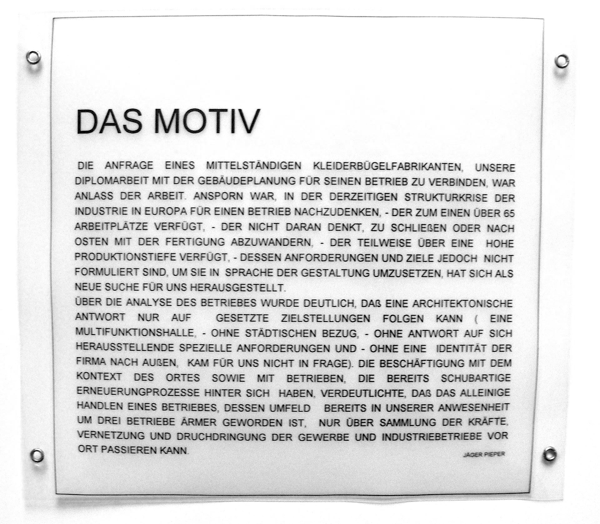 Entwurfsforschung und Ideenprojekt. Stadträumliche Analyse, Bestandsanalyse eines Industriebetriebs mit analytischen Zeichnungen, Interviews und Case-Studies; Gebäudeentwurf im Bestand und städtebauliches Projekt als Entwurf mit Entwicklungsszenarien. Ausstellung + Buch (134 S.). jp3_ Dagmar Jäger + Christian Pieper, 1996.