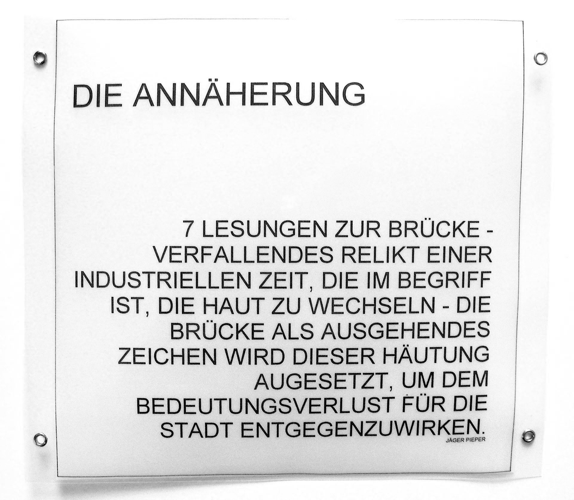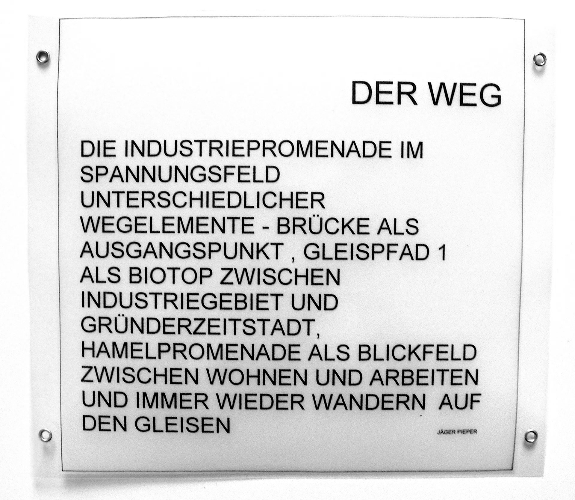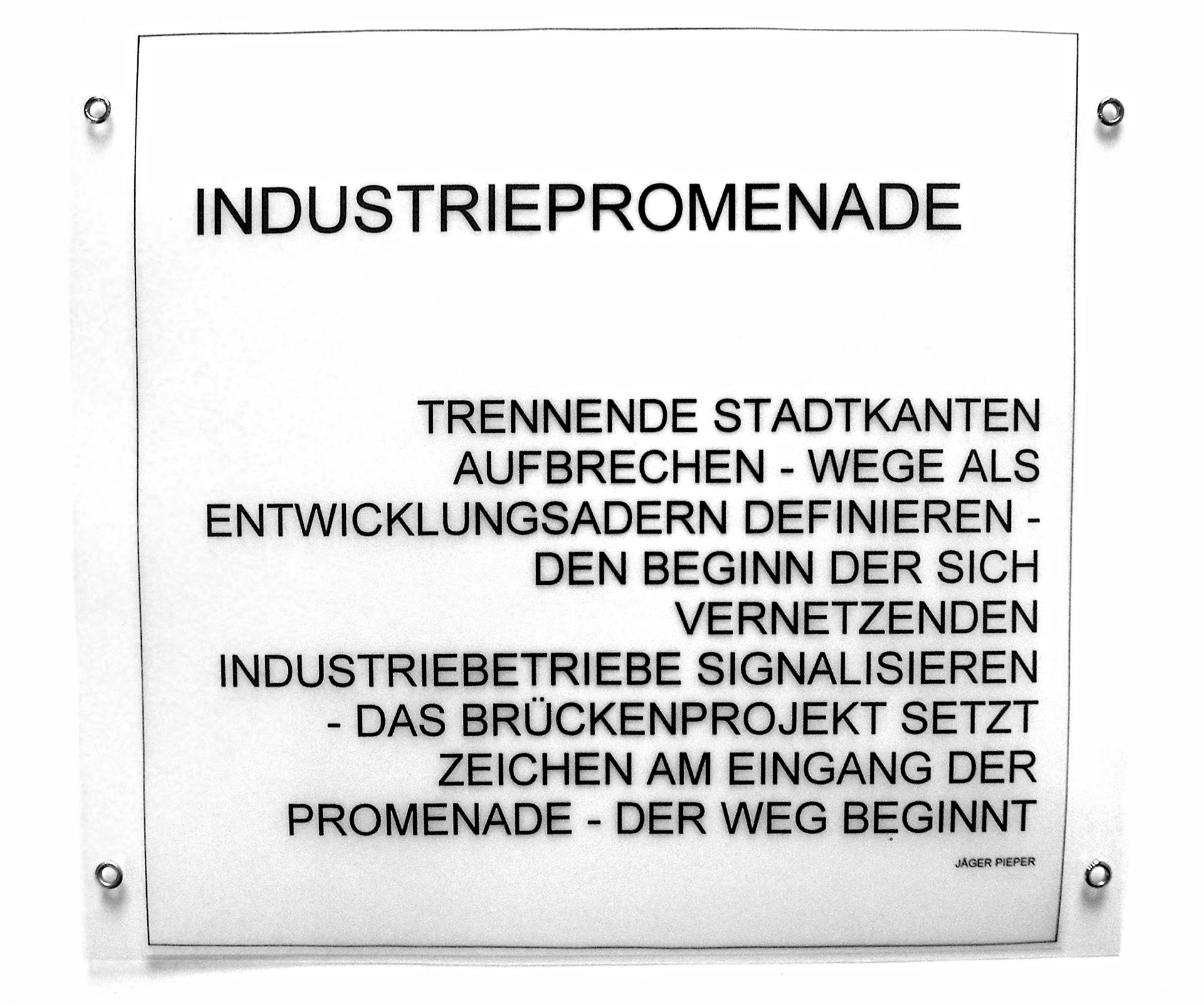 Entlang eines ehemaligen Gleisbetts verbindet die "Industriepromenade" die historische Stadt mit dem Industriegebiet und bildet Schnittstellen für die heterogene Stadtlandschaft des 20. Jahrhunderts. Die stillgelegte Eisenbahnbrücke wird zum ikonografischen Schaufenster der Industriekultur und zum Katalysator für lokale Synergien.