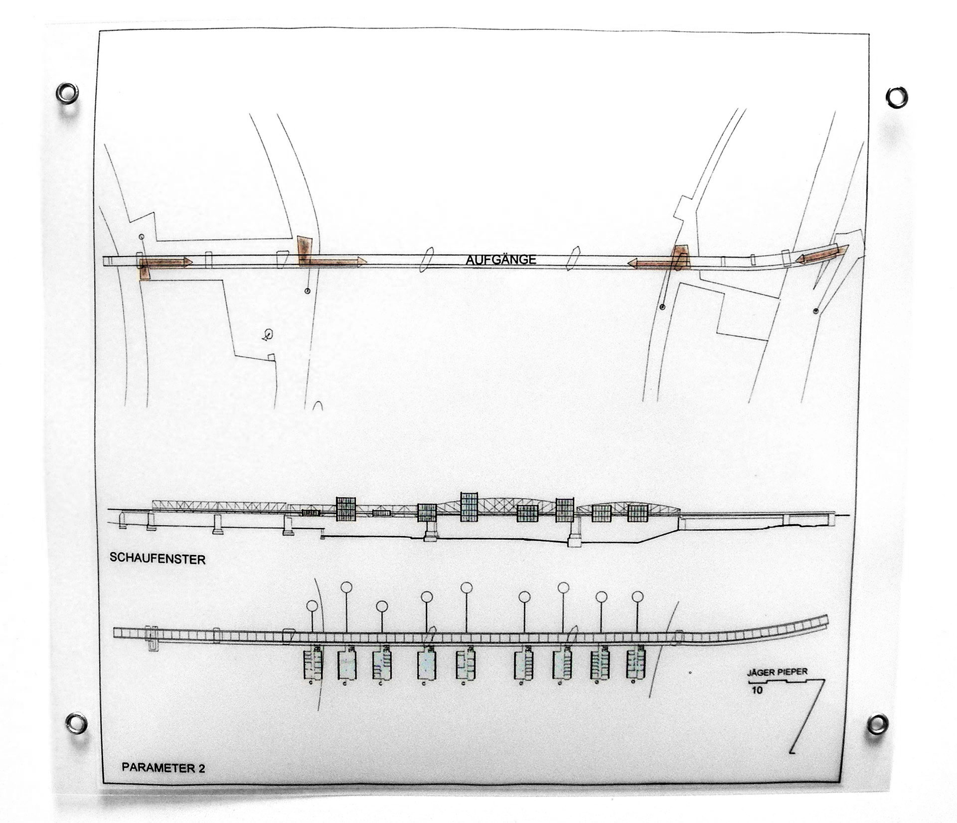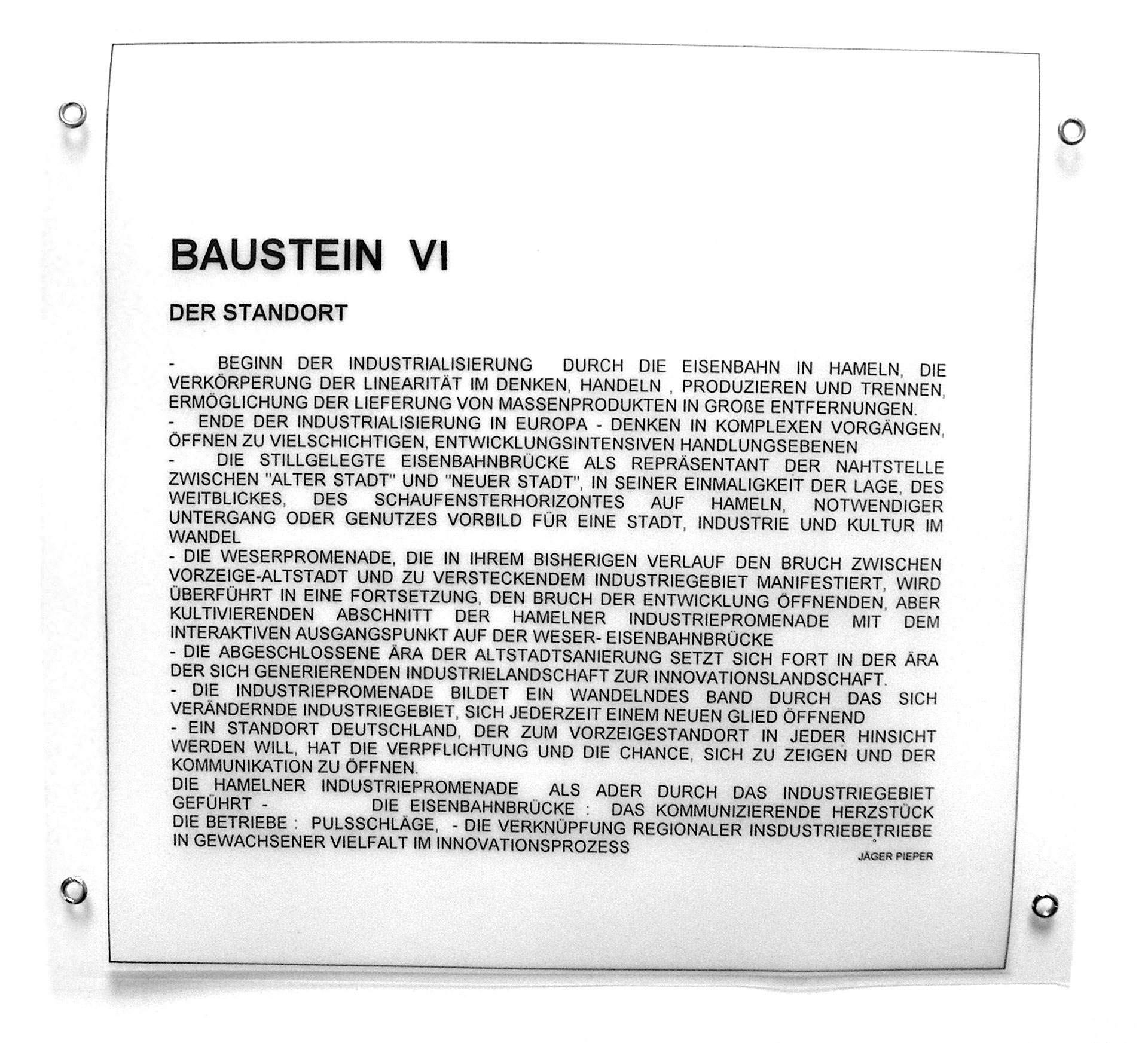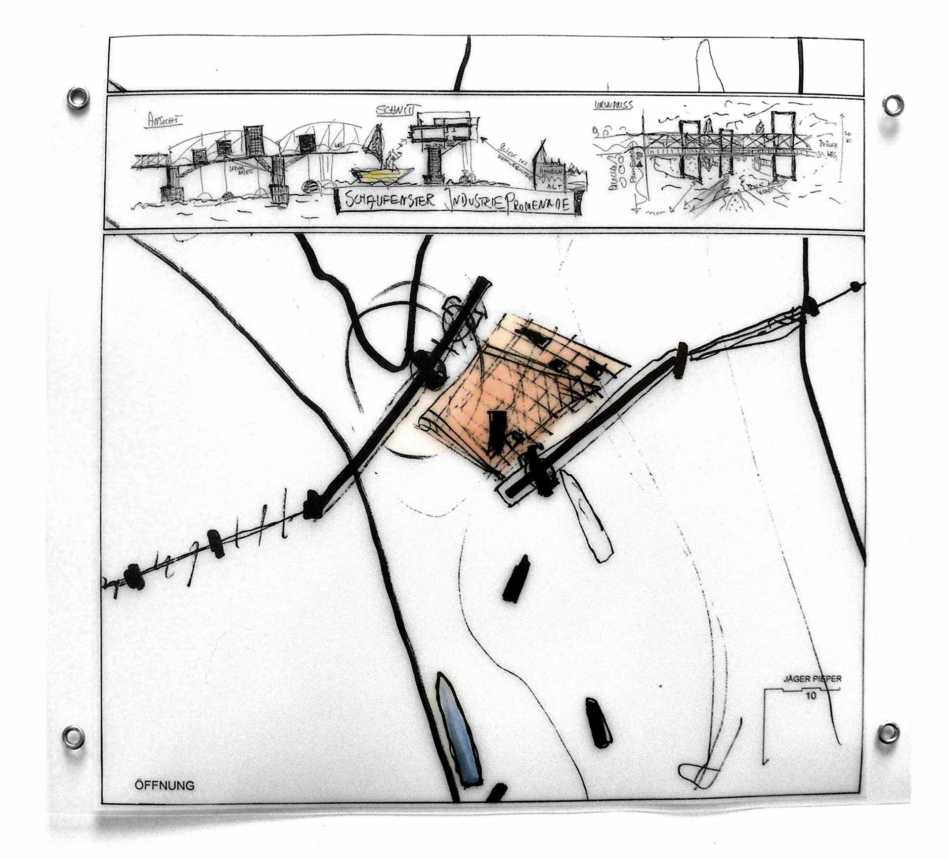Entlang eines ehemaligen Gleisbetts verbindet die "Industriepromenade" die historische Stadt mit dem Industriegebiet und bildet Schnittstellen für die heterogene Stadtlandschaft des 20. Jahrhunderts. Die stillgelegte Eisenbahnbrücke wird zum ikonografischen Schaufenster der Industriekultur und zum Katalysator für lokale Synergien.