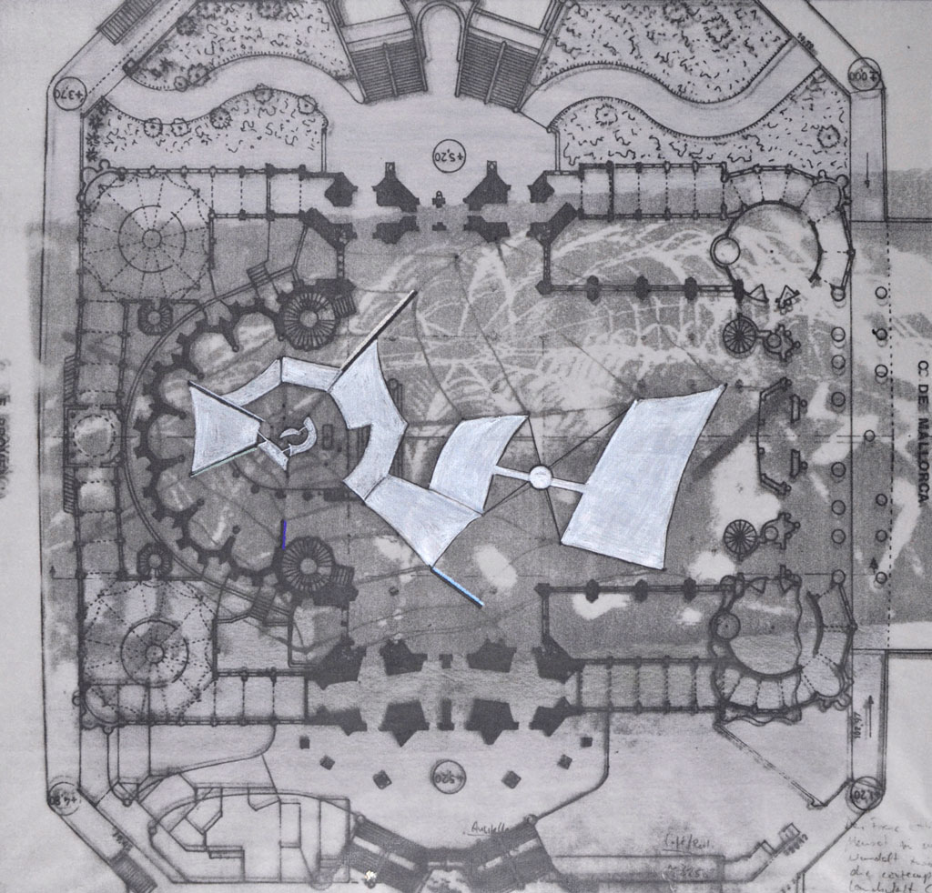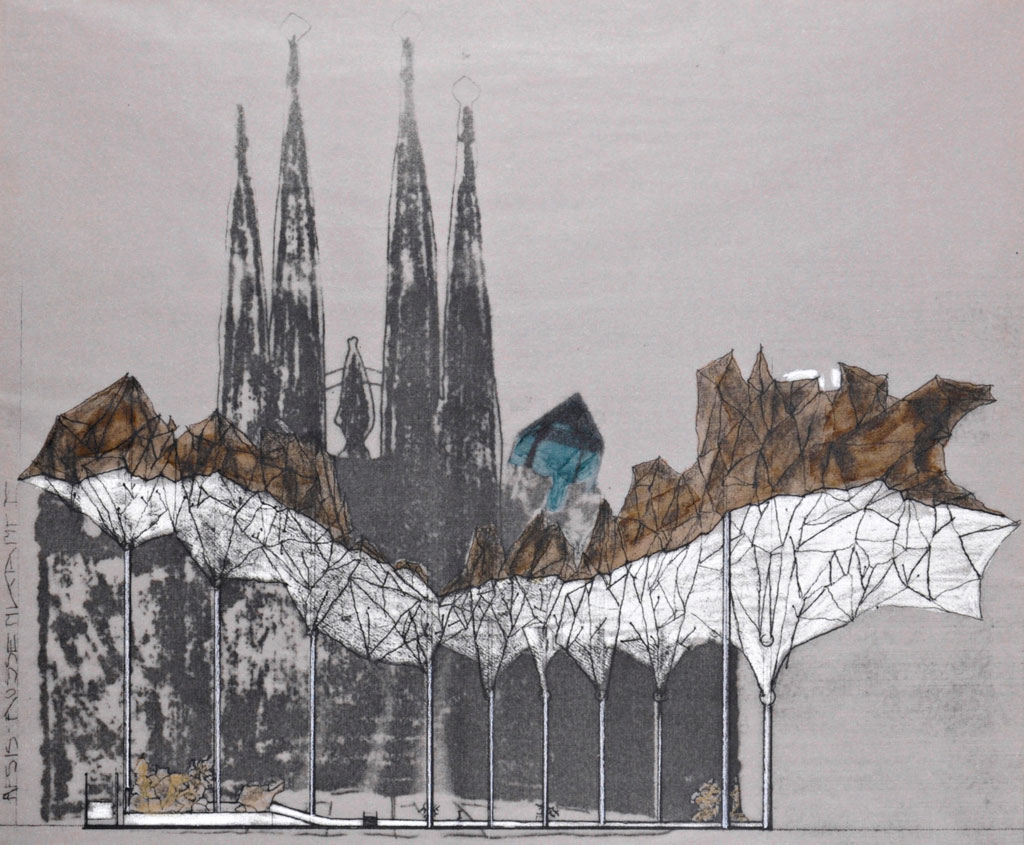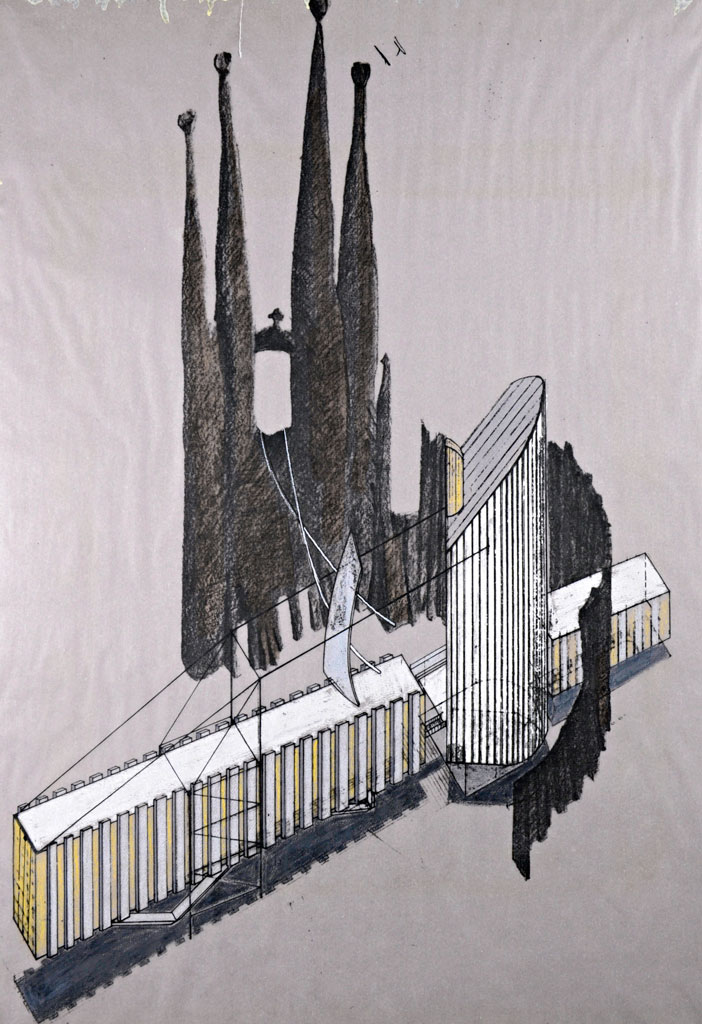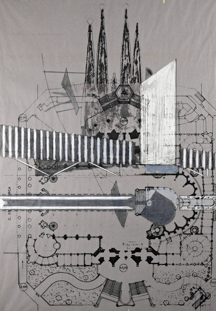 Drei Modelle und vier Skizzen dienen der Annäherung an mögliche Interpretationen als Verwandlungen und aneignende Transformationen des ursprünglichen Entwurfsgedankens. Drei Entwürfe zeigen alternative Positionen (stadt)räumlicher Interventionen in das vorhandene Gefüge des Gebäudes und Stadtraums auf, die jeweils mit unterschiedlichen Konstruktionsansätzen auf den biomorphen Entwurf durch Harmonisierung oder Kontrast zum Entwurfsgedanken Gaudís antworten und zugleich den städtebaulichen Widerspruch in der aktuellen Platzsituation zu beantworten suchen, um einen konzeptionellen Möglichkeitsraum als Beitrag zur Zukunft des unvollenderten Bauwerks aufzuspannen. Eine der drei Varianten wird zuletzt als Ausstellungsraum und sich nach oben entwickelnde Promenade – als 'Ort der Kontemplation in Bewegung' – durchgearbeitet, um einen Ort der Ruhe innerhalb des dichten Stadtrasters zu schaffen.